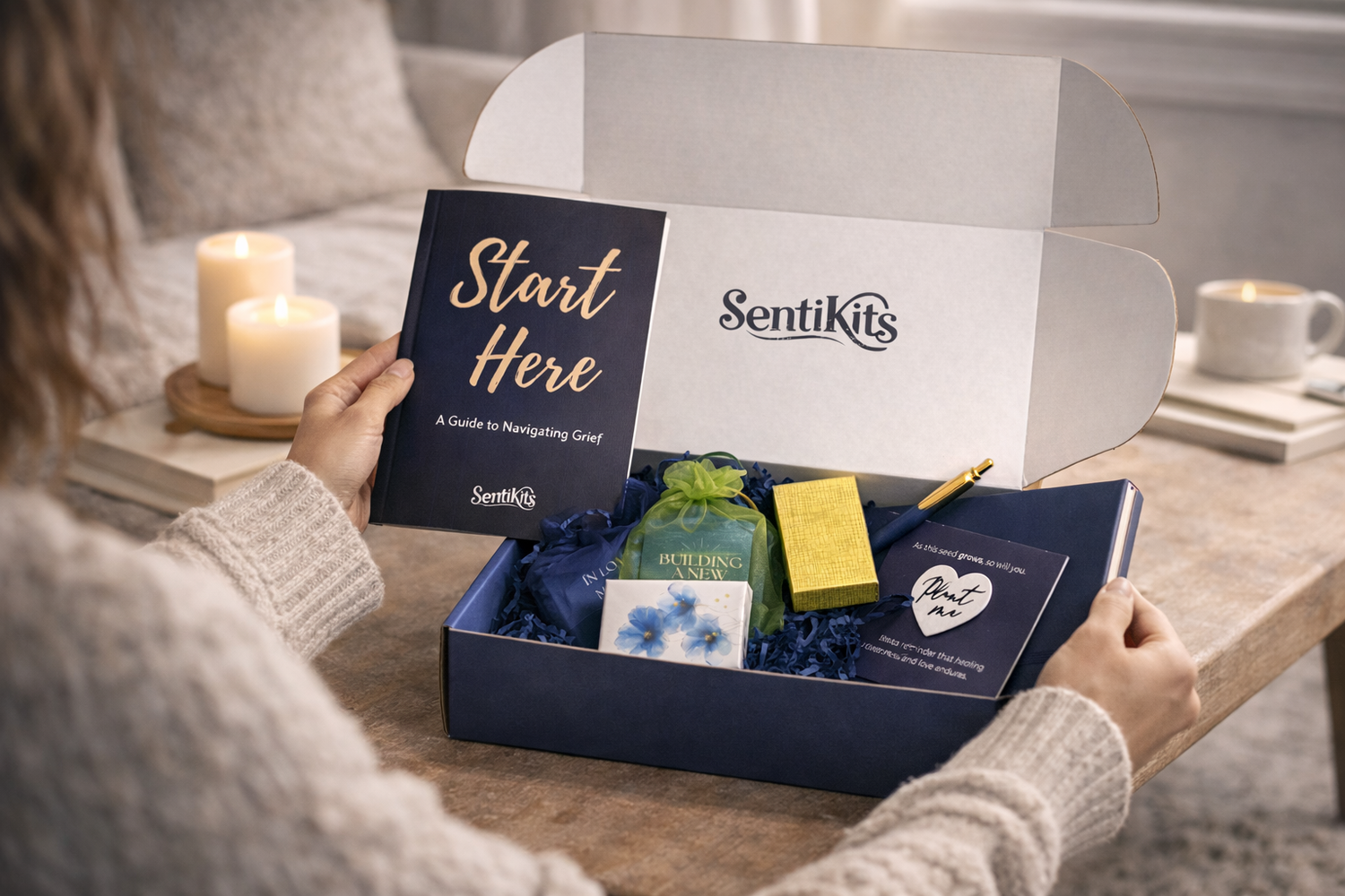 SentiKits offers thoughtfully designed kits to help someone feel supported through loss, change, and transition. Not to fix them. Not to rush healing. Just to offer care, structure, and presence when it matters most.